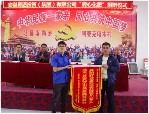 吐曼塔勒乡党委书记朱连飞代表乡党委、当地政府,以及治区工信厅驻阿亚克塔木村“访惠聚”工作队对灵通集团向阿亚克塔木村捐赠“爱心化肥”、用实际行动支持脱贫攻坚、支持美丽乡村建设的行为表示感谢。同时阿亚克塔木村党支部书记努尔麦麦提·卡米力代表村委会向灵通集团赠送了“勇担社会责任支援农业生产 助力脱贫攻坚共建美丽乡村”锦旗,送达了全体村民的感谢信,代表全体村民向自治区工信厅驻阿亚克塔木村“访惠聚”工作队长期以来对村民的关心关爱和无私帮助表示感谢,向灵通集团的爱心捐赠表示感谢。