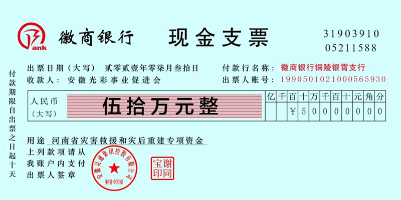 目前,河南省抗洪救灾仍在持续,河南灾情始终牵动着社会各界人士的心,灾后重建迫在眉睫。为了彰显光彩精神,帮助受灾群众早日度过难关、重建家园,作为安徽省光彩协会副会长,灵通集团董事长谢同宝伸出援助之手,向省光彩会捐赠人民币50万元,并通过安徽省光彩会转至河南省光彩会,用于支援河南灾后重建工作。