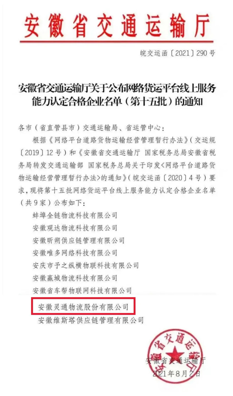 安徽灵通物流股份有限公司获批安徽省网络货运经营资质,这是公司网络货运业务由模拟到运营到实战上线的重要里程碑,标志着灵通物流正式跨入网络货运模式新时代。