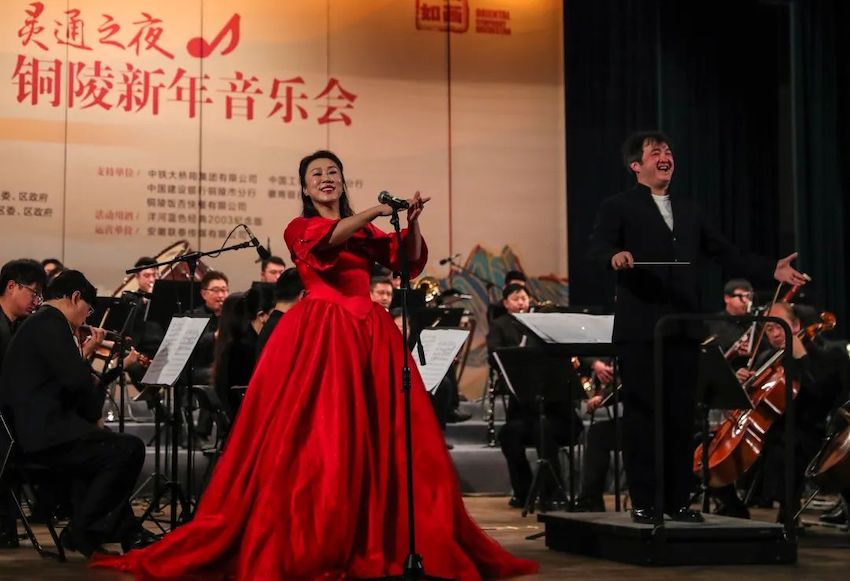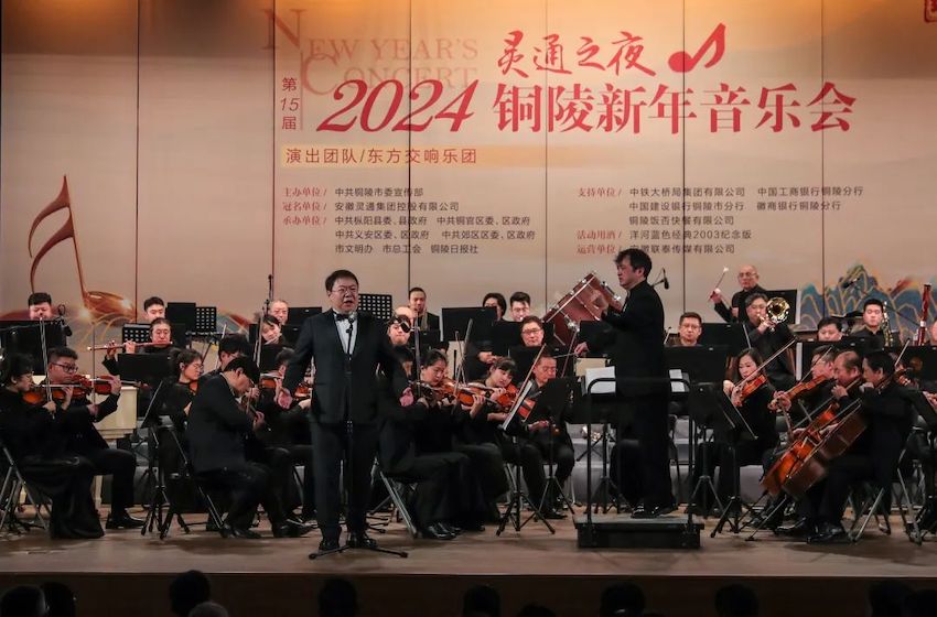 新年音乐会已是我市一项标志性文化庆典活动,由市委宣传部主办,今年是第十五次举办。今年音乐会由安徽灵通集团独家冠名,一县三区县(区)委、政府和市文明办、市总工会、铜陵日报社联合承办,中铁大桥局集团有限公司、工商银行铜陵分行等单位倾情支持。东方交响乐团成立于2003年,汇集一批优秀中青年音乐家,拥有丰富的音乐会及大型晚会现场乐队演出经验,曾荣获文旅部特别大奖;多次与国内外优秀指挥家、演奏家、歌唱家合作演出,受到业内外高度评价。执棒指挥当晚音乐会的是该乐团的首席指挥、旅法青年指挥家孙莹。